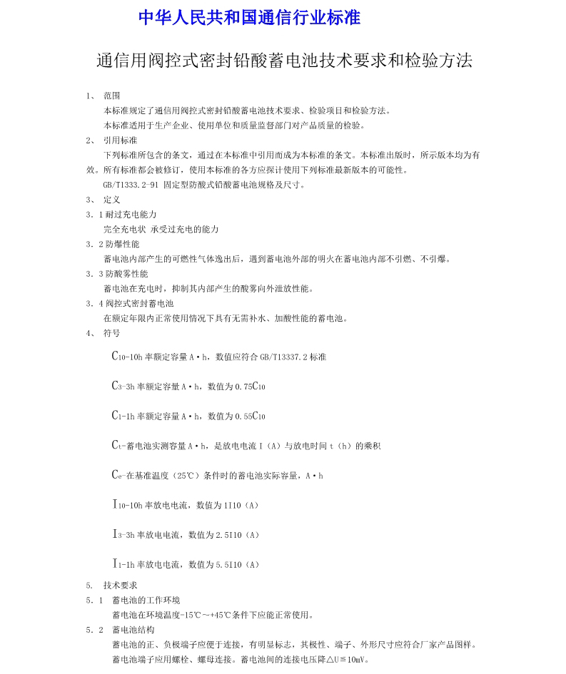 【资料文档】 通信用阀控式密封铅酸蓄电池技术要求和检验方法